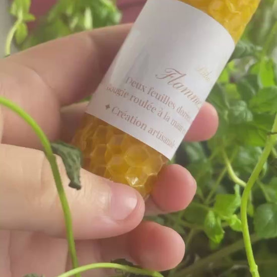 Façonnée à la main à partir de deux feuilles de cire d’abeille naturelle superposées, elle brûle plus longtemps qu’une bougie roulée classique, diffusant une flamme stable et généreuse.